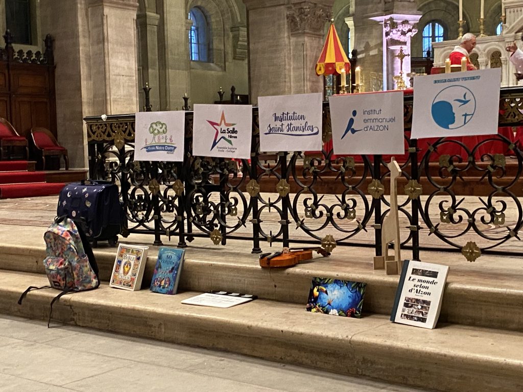 Au moment de la procession des offrandes, les élèves des différents établissements ont porté des objets symboliques représentant le quotidien de la vie scolaire et les valeurs de l’enseignement catholique.